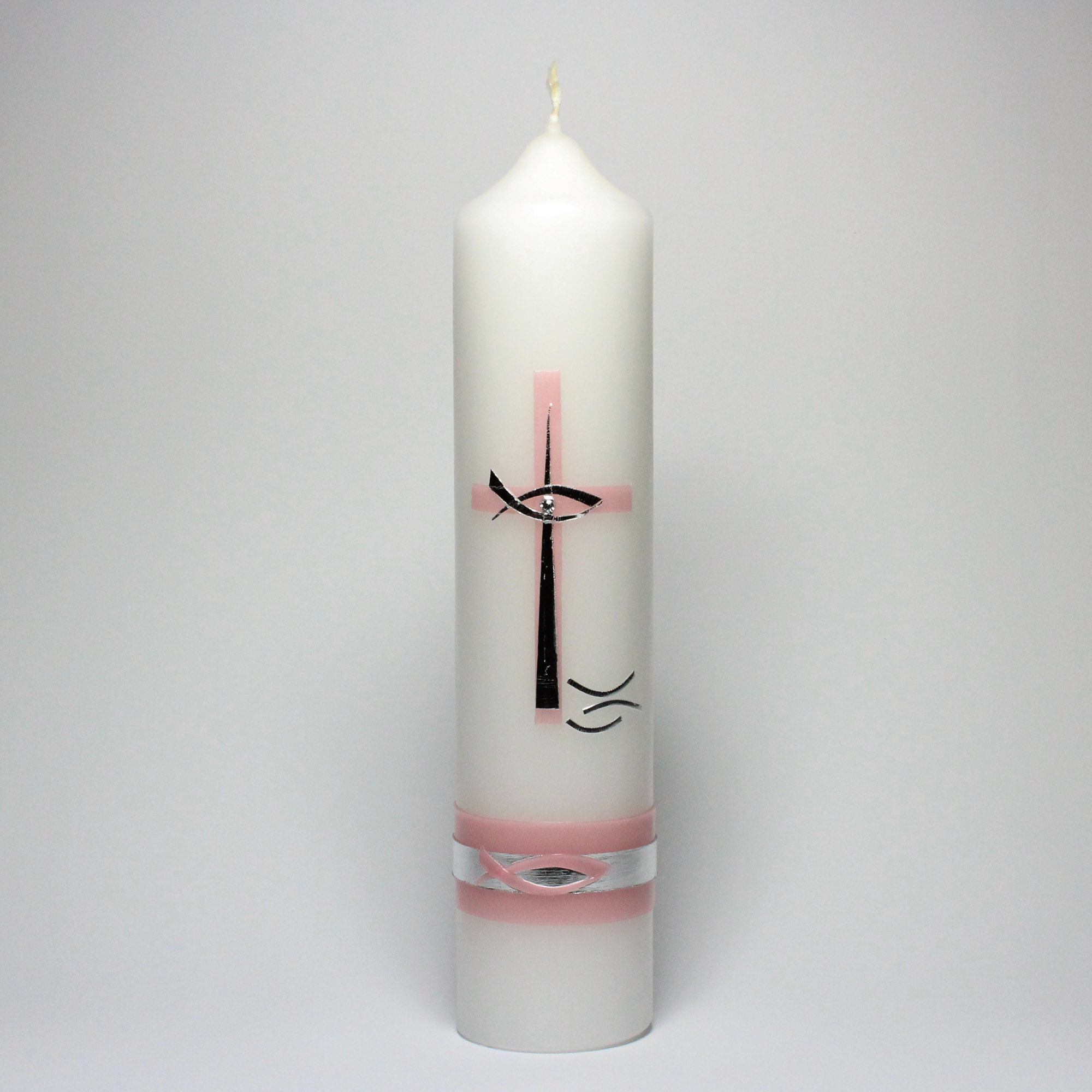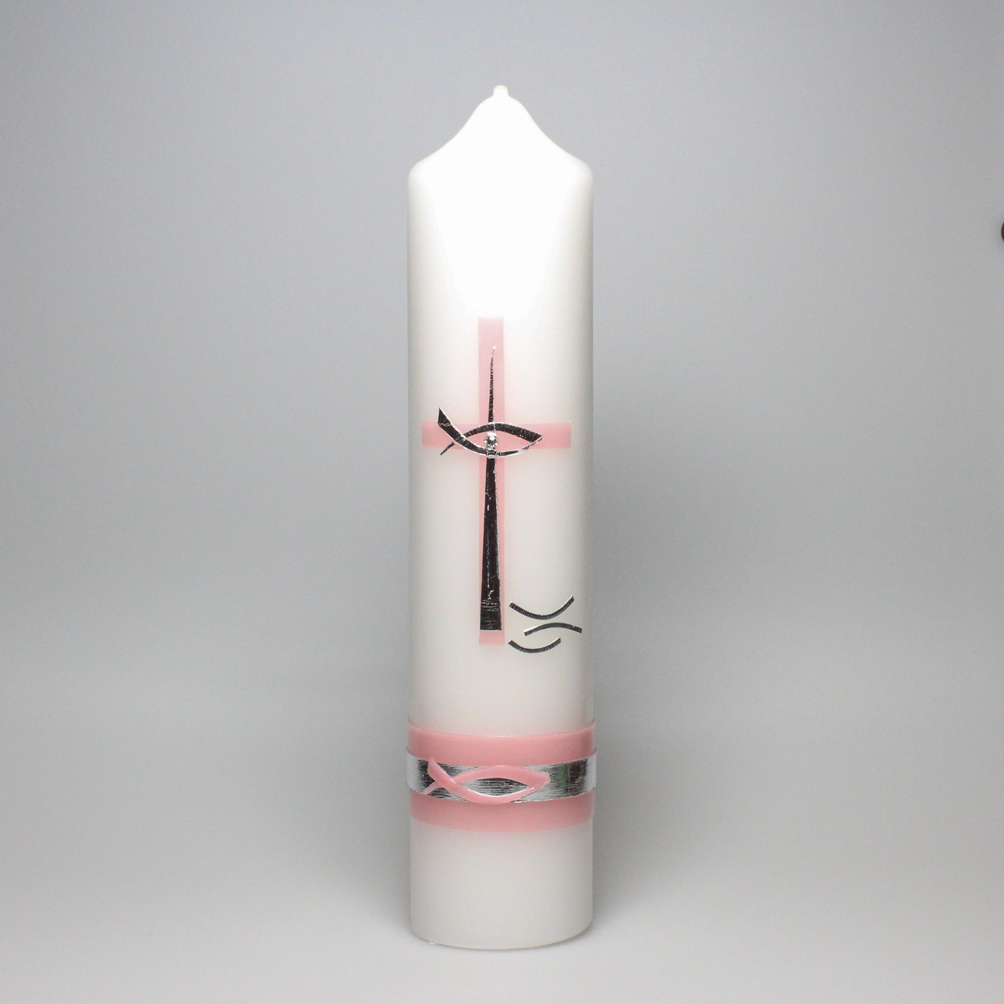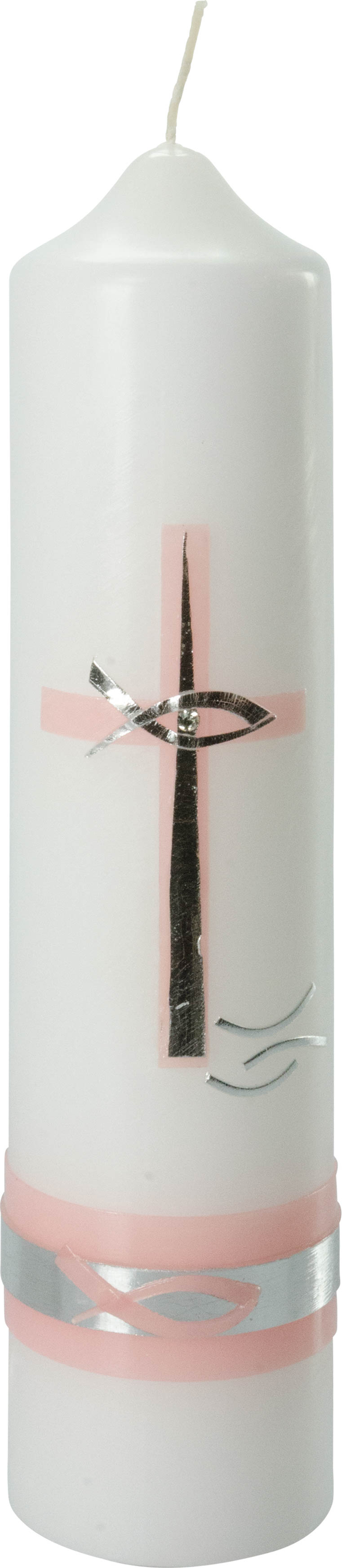 - im Zentrum eines zartrosa hinterlegten sillbernen Kreuzes glänzt ein silberner Fisch mit einem hellen Strassstein. Am Fuß des Kreuzes kräuseln sich drei stilisierte silberne Wellen. Im unteren Drittel dieser Taufkerze eine breitere zartrosa Banderole mit einem silbernen Mittelteil auf dem ein weiterer zartrosafarbener Fisch zu sehen ist