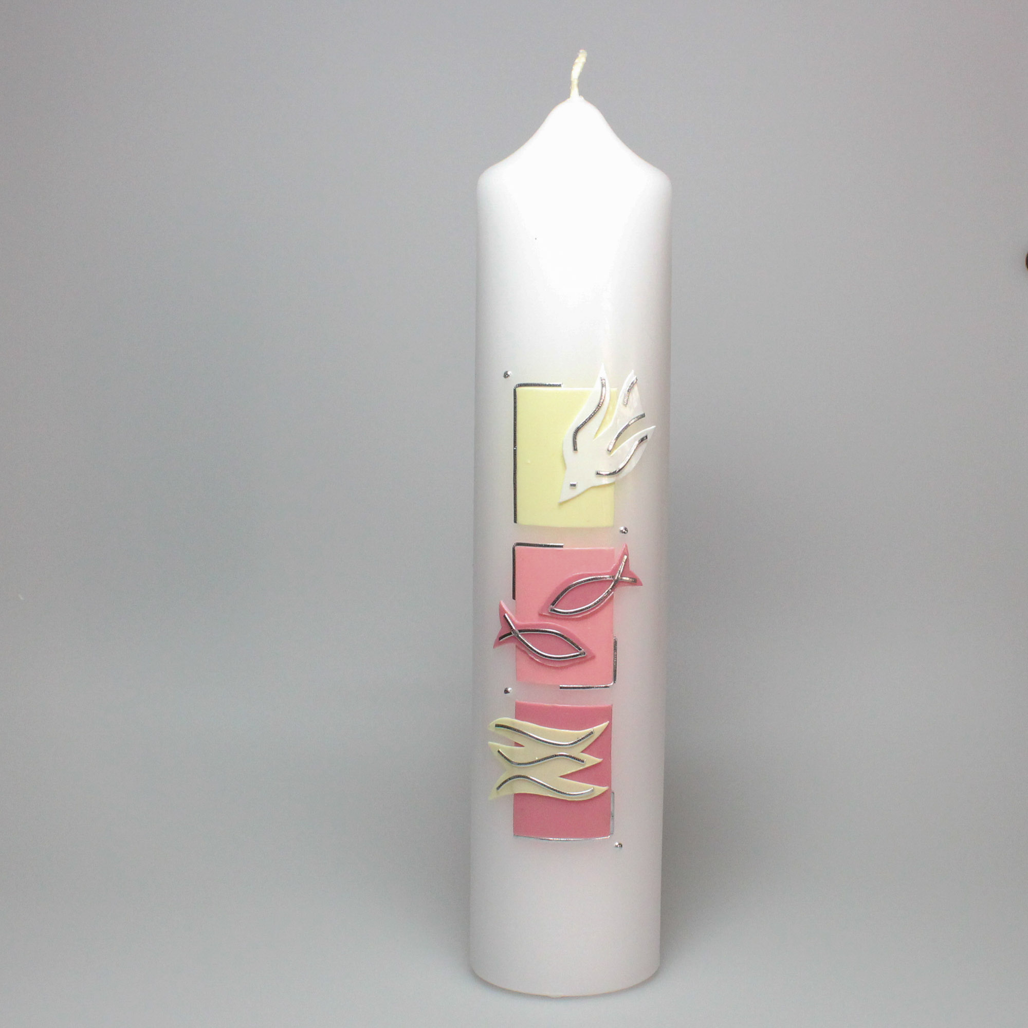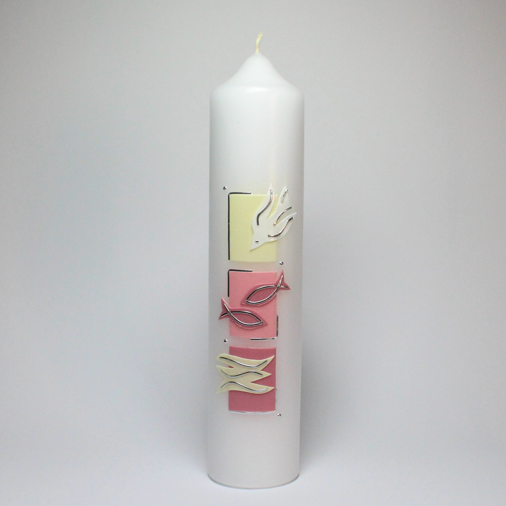 - diese Taufkerze ist reicht verziert: drei leicht silbern eingefasste Rechtecke in altrot, rosa und beige. In das obere beige Feld fliegt von rechts eine weiß-silberne Taube, ins mittlere rosafarbene taucht von beiden Seiten je 1 silbern, altrot hinterlegter Fisch ein und das untere wird von rechts durch 3 silberne, beige hinterlegte Wellen aufgebrochen. Ein Übriges tun die silbernen Perlentupfen
