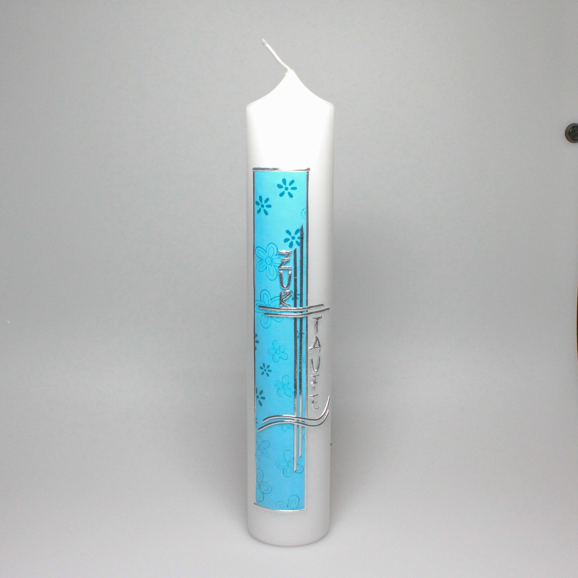 - auf dieser sehr fein dekorierten Taufkerze dominiert ein silber umrandetes, in sehr schönen helblau gehaltenes ca. 3 cm breites und ca. 19 cm hohes Feld. Die vielen dunkelblauen und ganz fein angedeuteten Blümchen der Taufkerze passen hervorragend zum kleinen Erdenbürger. Das silberne Kreuz aus 2 Strichen, 2 silberne Wellen und der der silberne Schriftzug "Zur Taufe" veredeln die Taufkerze