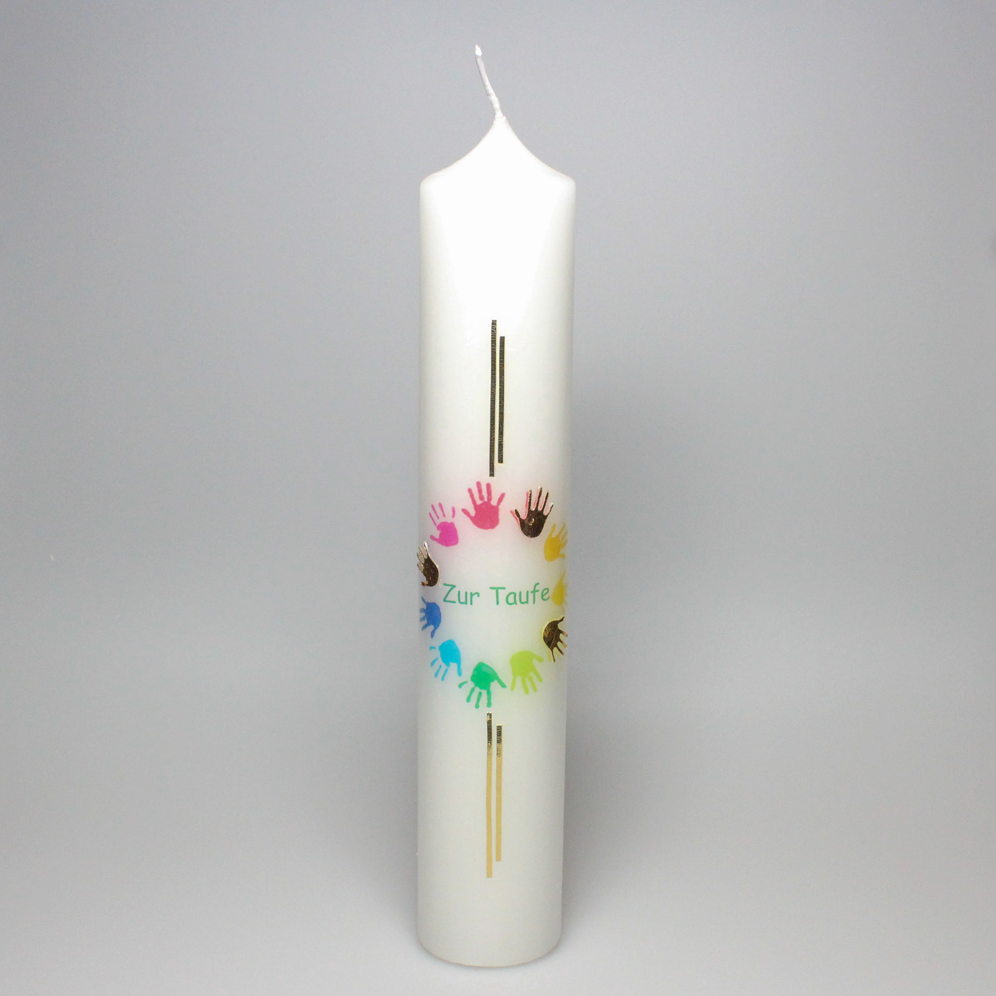- das Besondere dieser Taufkerze ist die Gestaltung 'wie von Kinderhand': im Zentrum zweier dünner goldener Linien befindet sich ein Kreis aus 11 Kinderhänden-Abdrücken in einer vielfältigen Farbpalette von grün, blau, rot, gelb und gold. Im Innern des Kreises der Schriftzug "Zur Taufe" in einem frischen grün