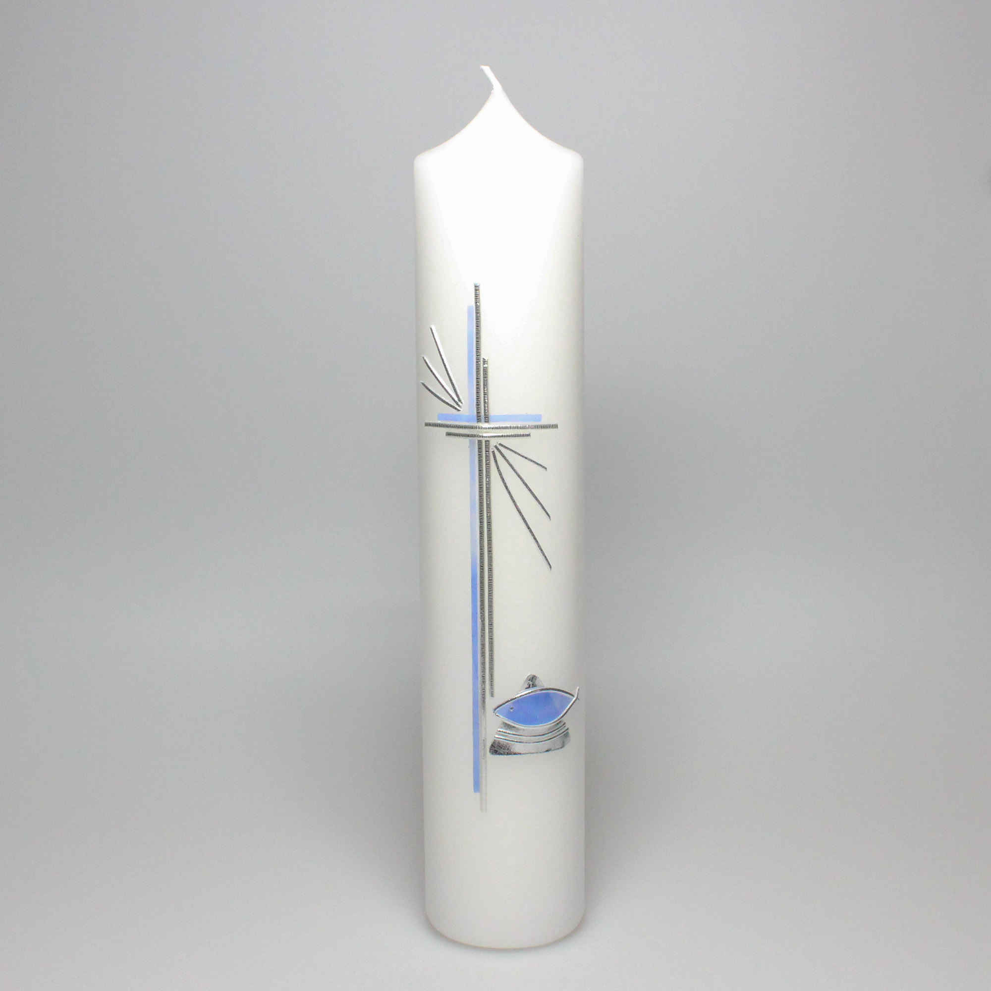 - das Kreuz dieser Taufkerze besteht aus 2 feinen aufgesetzten silbernen Linien. Die schmale, hellblaue durch einen Pinselstrich entstandene Linie an der Seite unterstreicht die Wirkung des Kreuzes genau so wie die 3 silbernen Linien, die aus dem Zentrum strahlen. Am Fußes des Kreuzes schwimmt ein hellblau-silberner Fisch auf einem silbernen Kegel