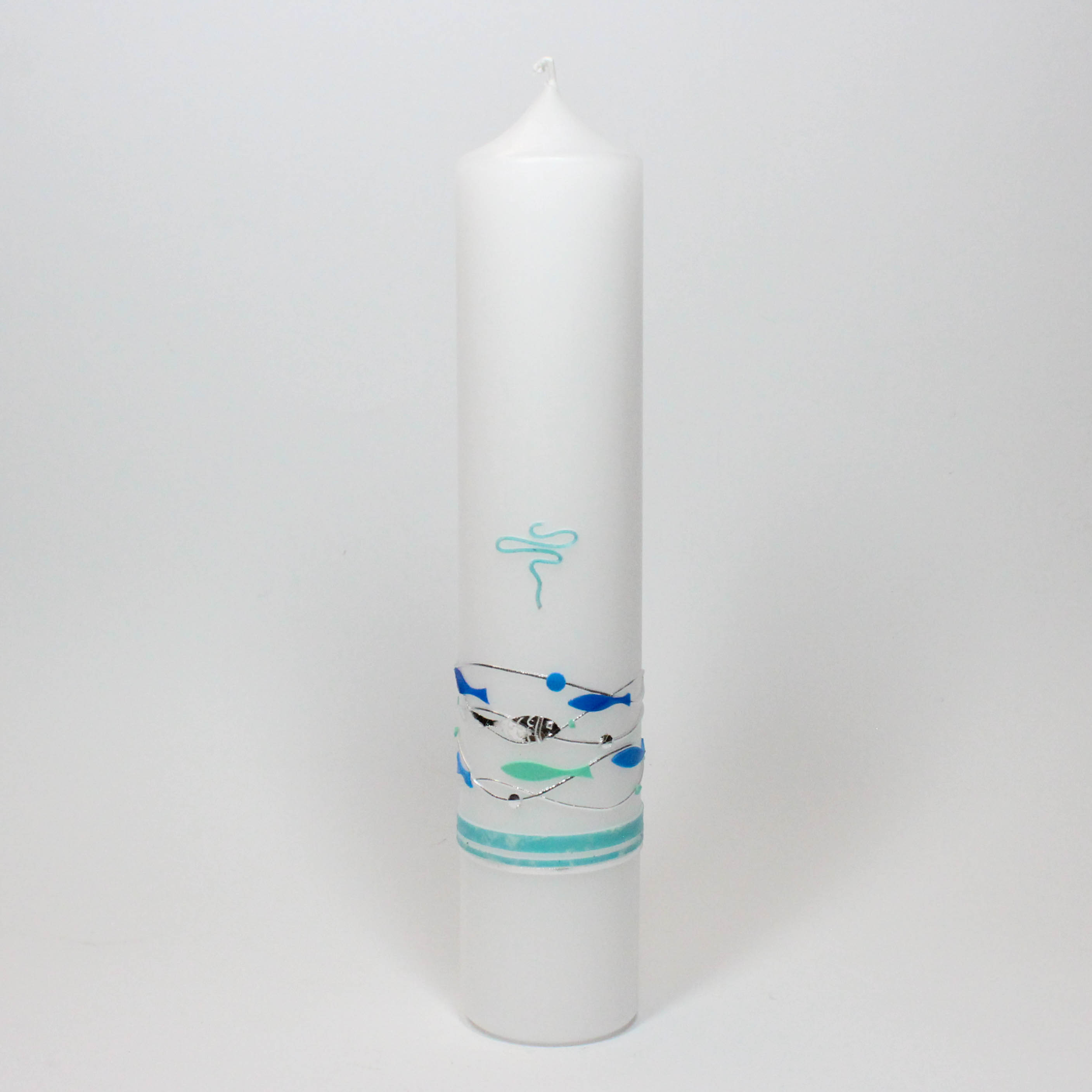 - eine Taufkerze in modernem Outfit: im unteren Teil ziehen sich fast um die ganze Kerze feine silberne Linien, an denen Fische in türkis, hellblau und dunkelblau aufgereiht sind. Eine Bordüre aus zwei türkisen und einem silbernen Streifen schließen die Taufkerze unten ab - die kleinen geschwungenen türkisen Schleifen oben geben den letzten Pfiff