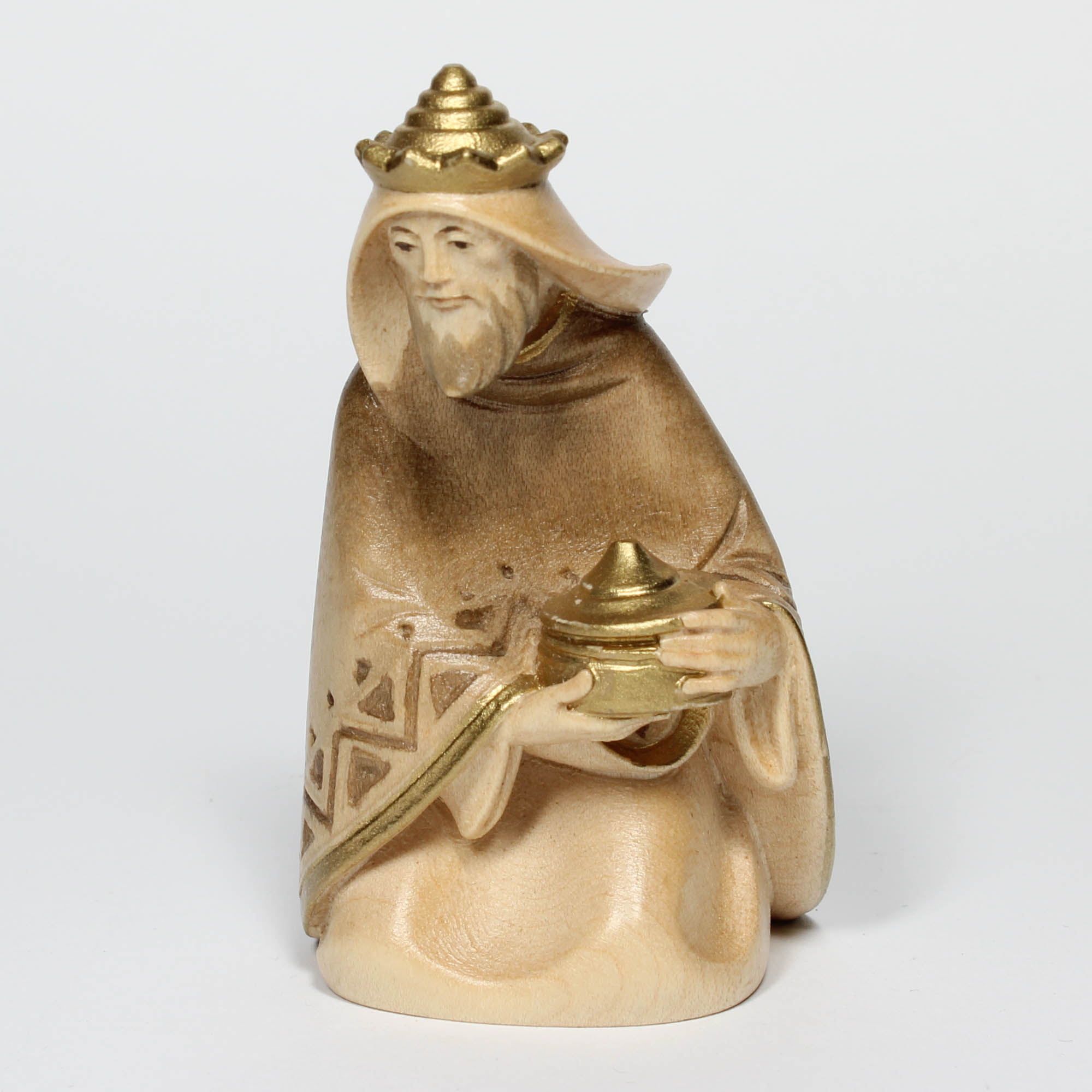 - Der König kniend wird im Grödnertal aus Bergahornholz geschnitzt und gebeizt. Dadurch dunkelt die Figur nicht mehr nach