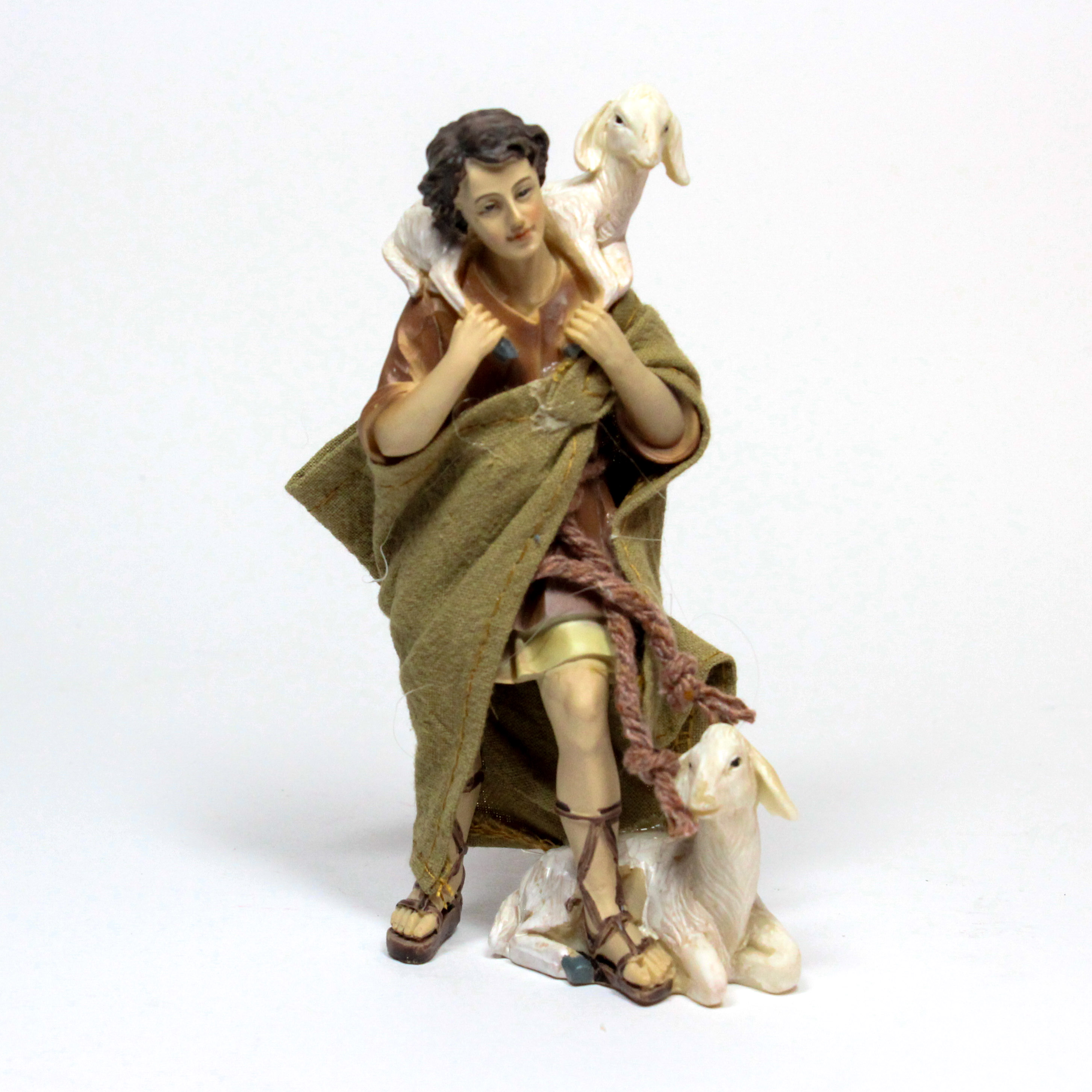 der Hirte ist ca. 12,5 cm groß und orientalisch mit Stoff bekleidet. Das kleinere Schaf trägt er auf den Schultern, das größe liegt zu seinen Füßen