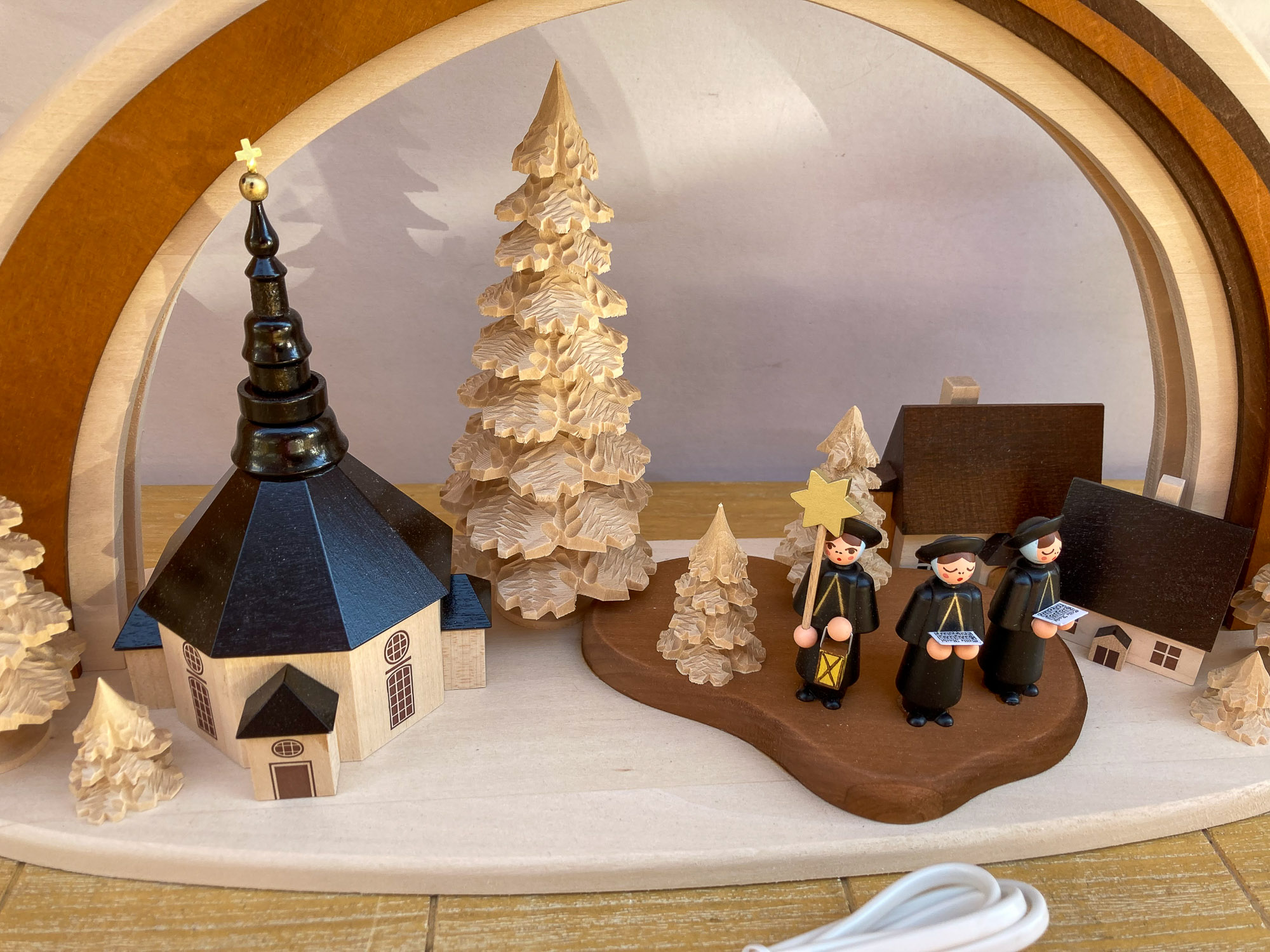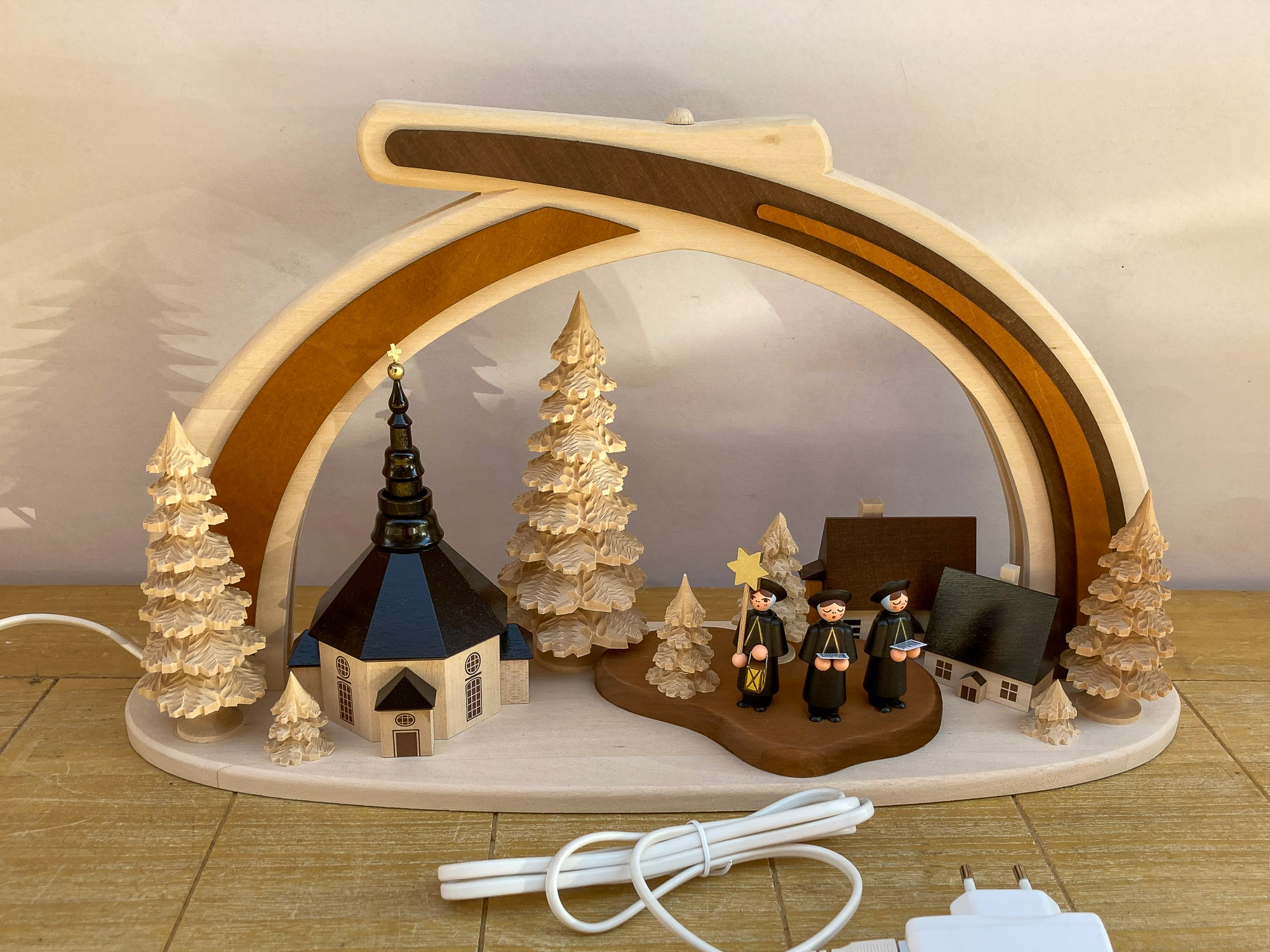 Massivholzbogen "Seiffener Kirche mit Kurrendensängern" mit LED-Stripe